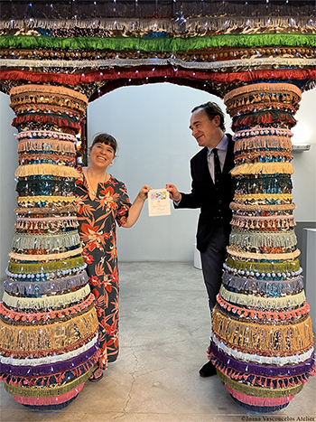 Joana Vasconcelos et Julien de Beaumarchais de Rothschild tenant l’œuvre dans l’atelier de l’artiste
